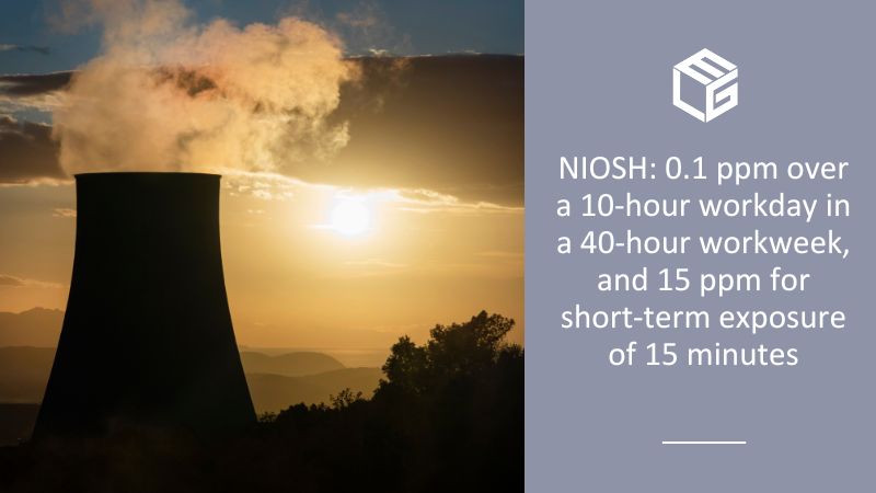 The National Institute for Occupational Safety and Health (NIOSH) has established a recommended exposure limit (REL) of 0.1 ppm (parts per million) over a 10-hour workday in a 40-hour workweek, and 15 ppm for short-term exposure of 15 minutes. The organization also specifies that an 800 ppm exposure poses an immediate risk of death or serious health effects.